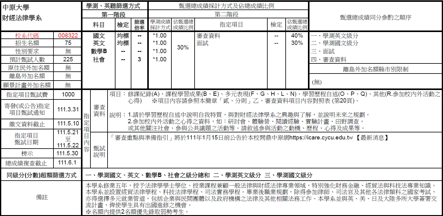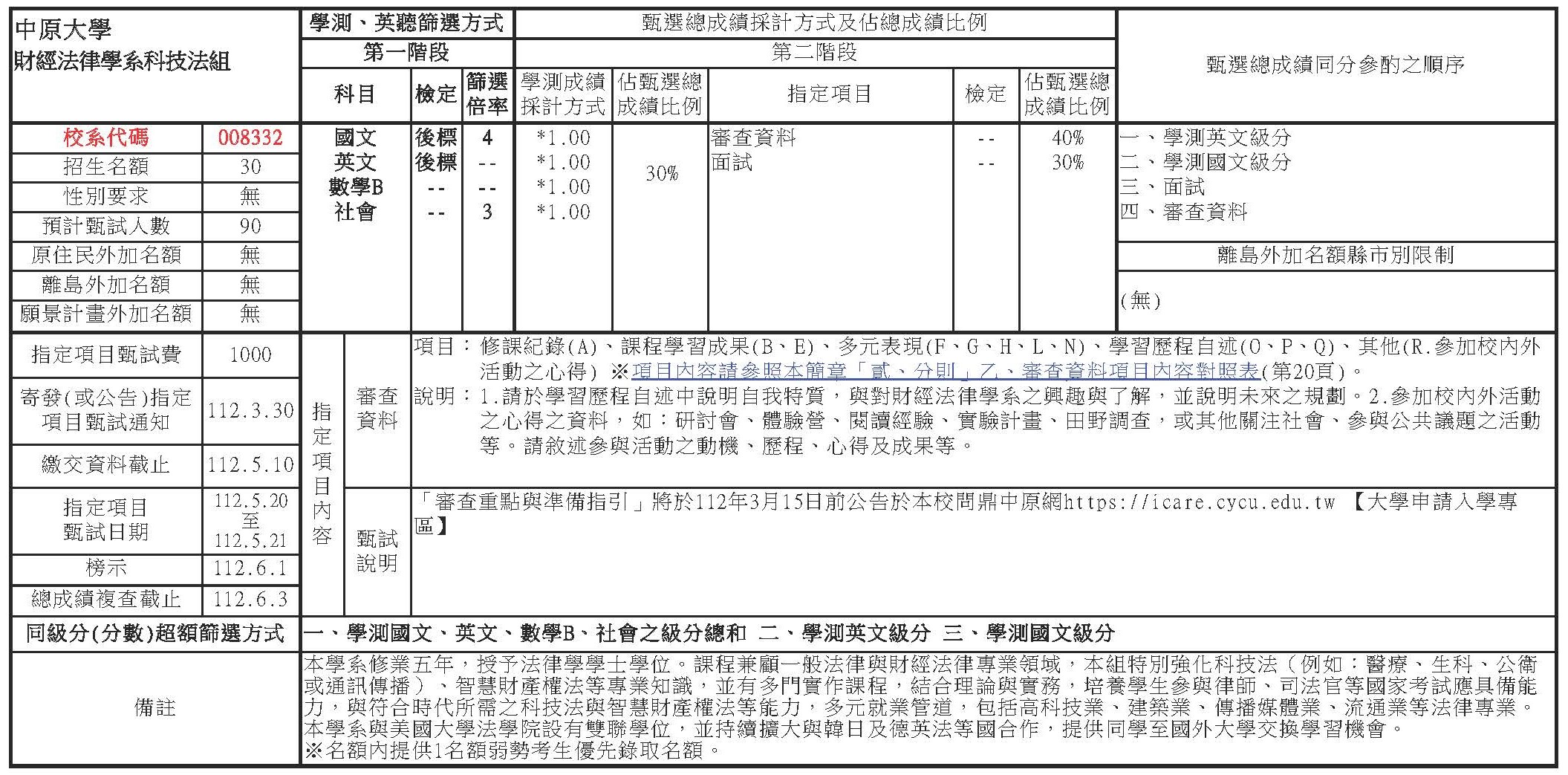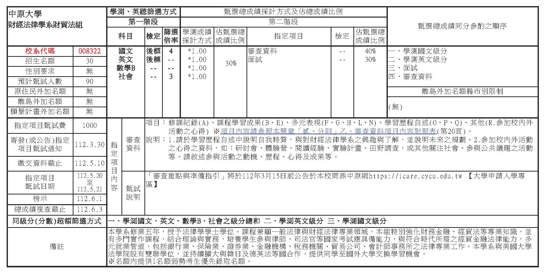 (總成績同分參酌之順序:1.學測國文級分 2.學測英文級分 3.面試 4.審查資料)