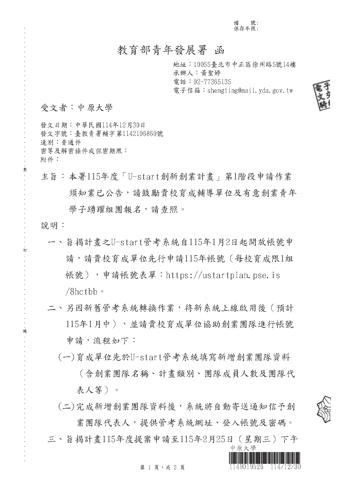 「U-start創新創業計畫」申請作業
