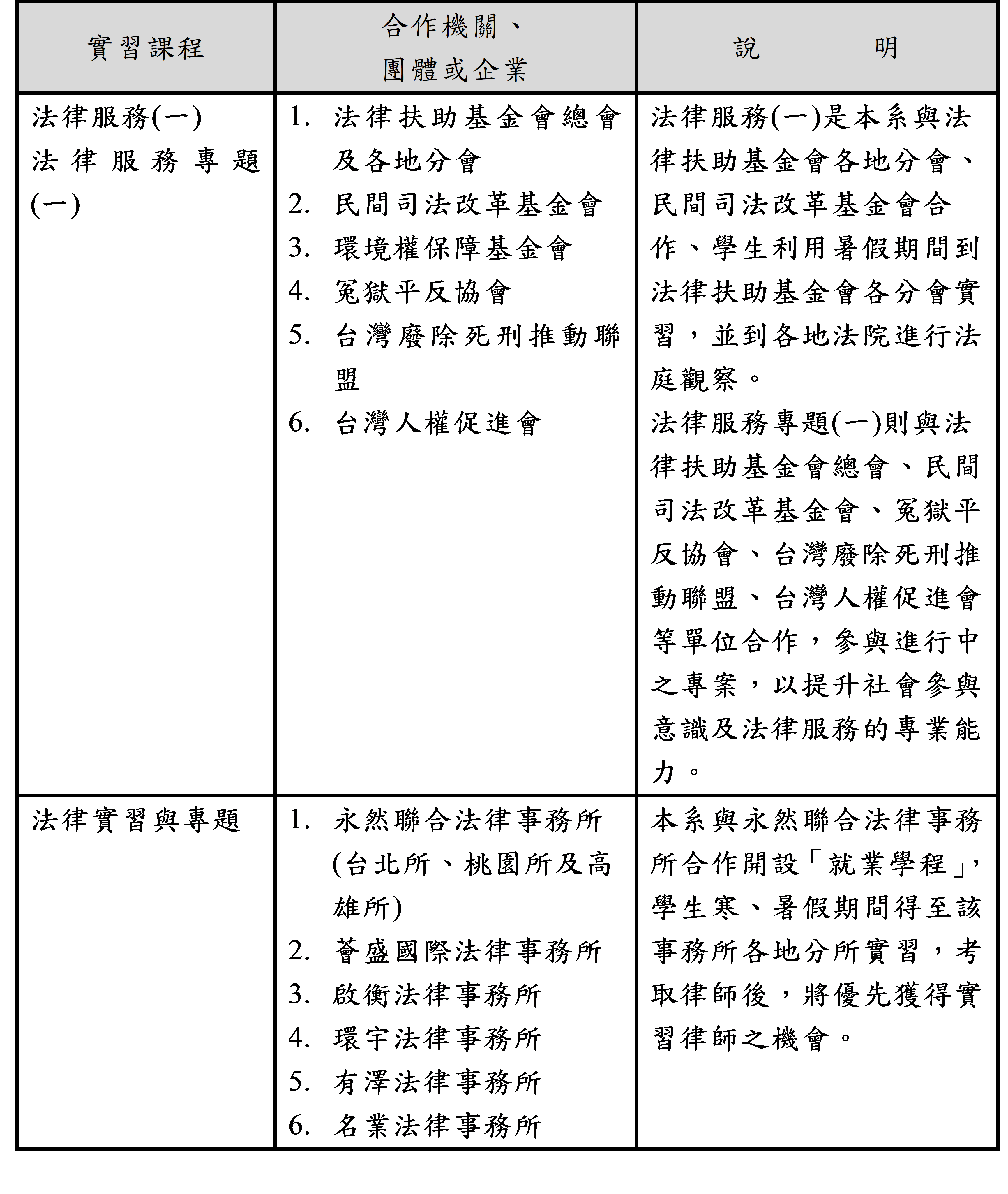 本系以「強化法律實作課程,結合理論與實務,並培養社會關懷理念。」為發展特色,實習與服務提供同學實用法律知識的機會,法律諮詢服務除讓學生熟習法律實務,學以致用外,也是養成服務社區及關懷社會的動力。