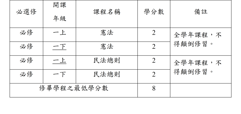 憲法是規定國家基本組織,及國家和人民間基本權利義務及其他重要制度的根本大法,也是國家考試必考之共同科目,為本系一年級之全學年必修課程共4學分。民法是規範人民私人間私權關係的法律,分為總則、債、物權、親屬、繼承共五編,本系安排於一至三年級必修課程共24學分,「民法總則」乃民法各編之通則,亦為私法領域之重要基礎,為本系一年級之全學年必修課程共6學分,適合外系學生探索法律之入門課程。
