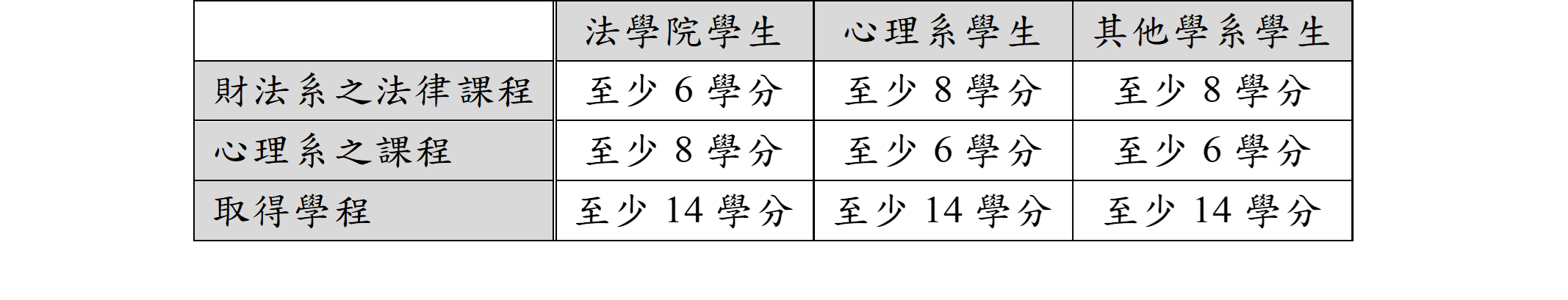 財法系、心理系與其他學系學生修習本學程之學分數配置,如下表: