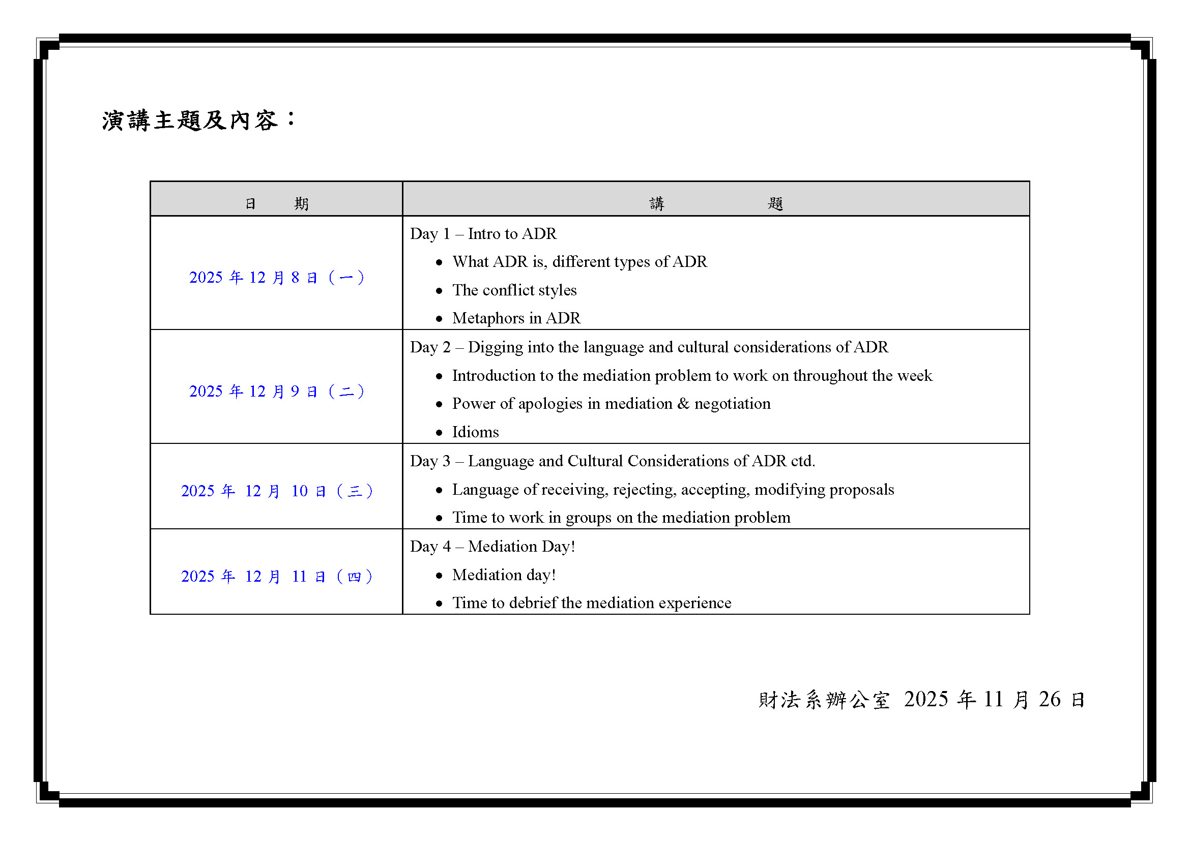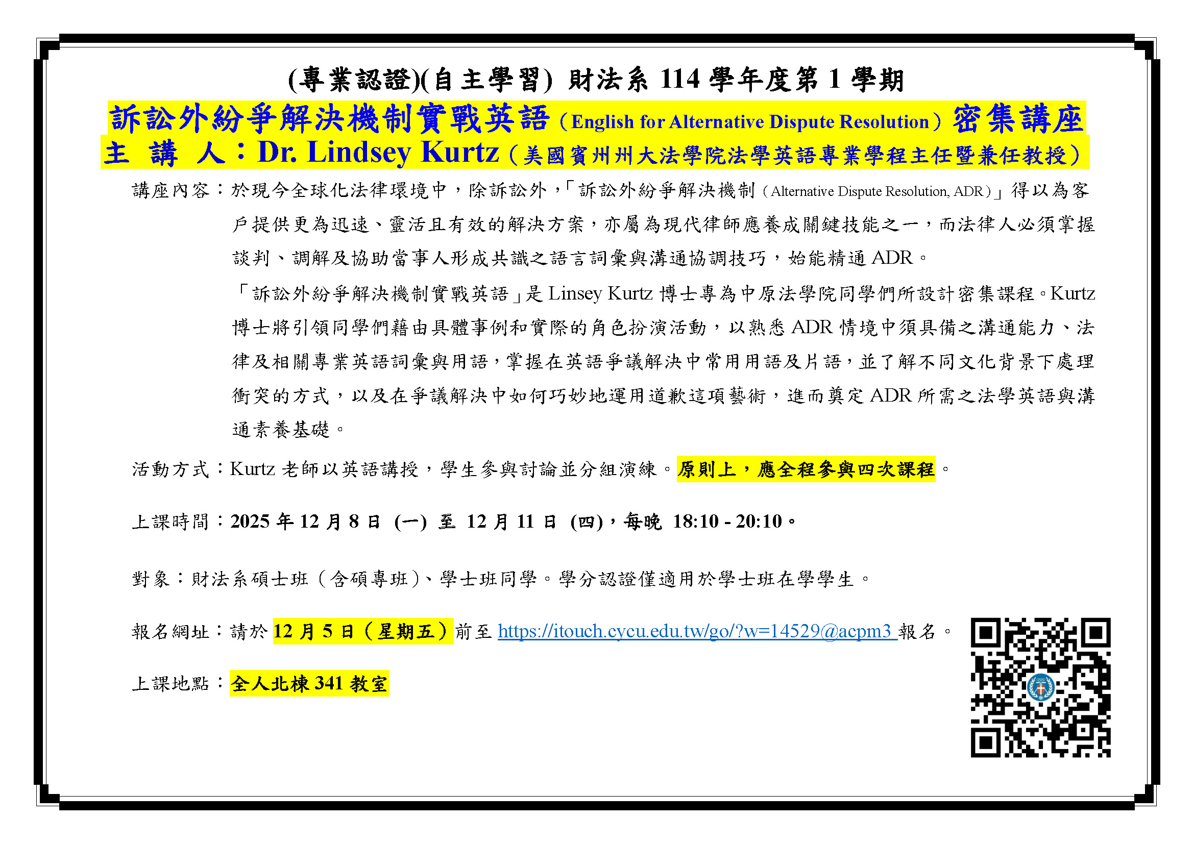 (內容修正)財法系114-1 訴訟外紛爭解決機制實戰英語(English for Alternative Dispute Resolution)講座