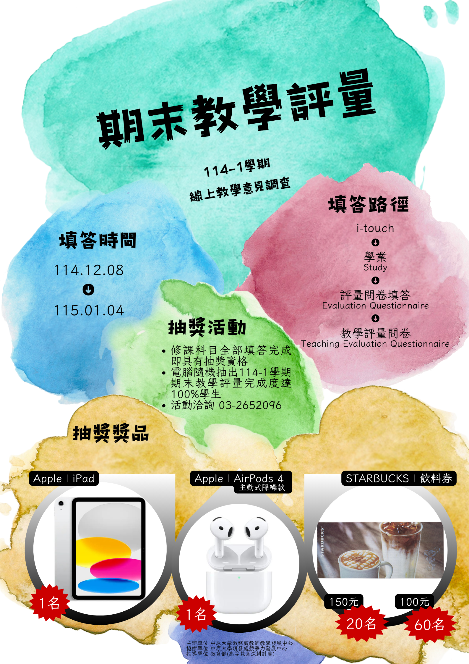 學生填答路徑:中原大學首頁→i-touch→學業→評量問卷填答→教學評量問卷